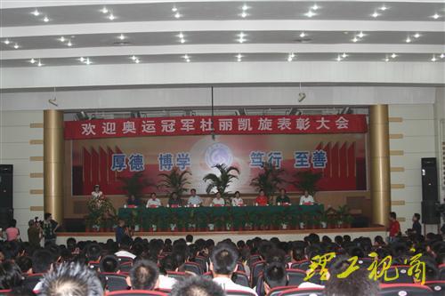 上午11点,欢迎奥运冠军杜丽凯旋表彰大会在3号教学楼报告厅隆重举行,校领导都光珍、张新义、张元利、王学真、谭秀森、杜瑞成、姚德及淄博市体育局局长翟慎政出席了大会,500余名师生代表参加了表彰大会,表彰大会由副校长谭秀森主持。