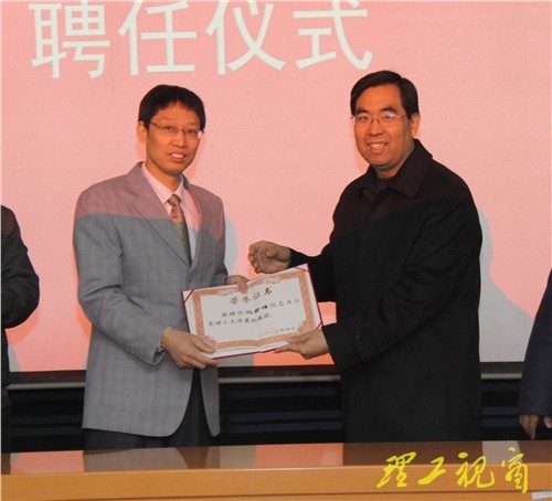 主题学术报告会后,学校举行聘任仪式,聘任上海交通大学化工系主任马紫峰教授为兼职教授,吕传毅为马紫峰颁发了聘书。