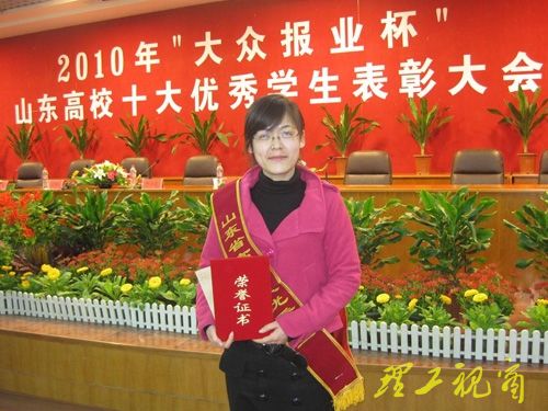 4月29日下午,由山东省委高校工委和大众报业集团联合举办的2010年“大众报业杯”山东高校十大优秀学生表彰大会在济南大学隆重举行。省委高校工委副书记齐秀生、副书记邢善萍,大众报业集团党委常委、副总编辑魏武等有关领导出席会议并为十名优秀大学生颁发证书和奖金。我校孙潇获得2010年“大众报业杯”山东高校十大优秀学生荣誉称号,成为我校继户安军、王娟、淡天俊、曲树森、孙法玲之后又一获此殊荣的学生。