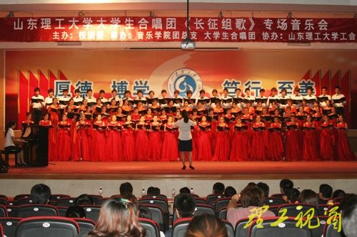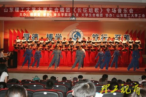 合唱共分告别、突破封锁线、遵义会议放光辉、四渡赤水出奇兵、飞越大渡河、过雪山草地、到吴起镇、祝捷、报喜、大会师10个乐章。组歌以恢宏的气势、精湛的音乐语言和深刻的思想内涵,再现了长征这一中国革命与人类历史上的艰难壮举与奇迹。“红旗飘,军号响,子弟兵,别故乡……”从《告别》中的缠绵离去,到《过雪山草地》的悲壮与艰难,再到《祝捷》、《报喜》、《大会师》的喜悦……在山东省第三届合唱比赛伴奏一等奖获得者丛雯雯等人的伴奏下,我校教职工合唱团和大学生合唱团用充满激情的演出,将70多年前的那一幕幕场景生动地再现出来。