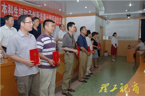 该计划旨在充分发挥教授(博士)在本科生培养中的作用,加强对学生的人生理想和信念教育,针对学生的个性发展需求,对学生进行思想品德、专业学习和身心素质发展等方面的指导,引导学生确立远大目标,树立崇高的理想,使优秀本科生脱颖而出,成为面向未来具有国际视野的高素质人才。该项培养计划从2008级本科生开始,经过遴选,共确定指导教师13人,本科生35人。与会领导为指导教师颁发了聘书,结对子的老师和学生依次上台结成了对子。