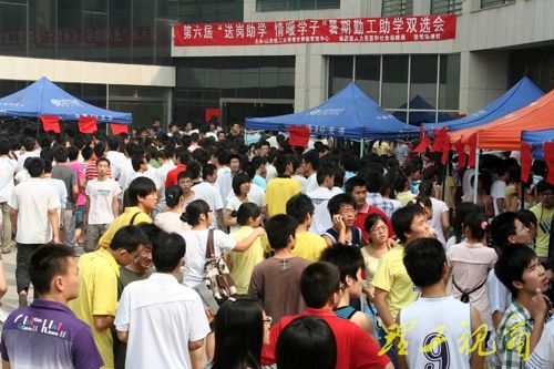 7月11日上午,我校第六届“送岗助学、情暖学子”暑期勤工助学双选会在大学生事务中心举行。鲁中地区40多家用人单位前来招聘,提供了近千个暑期勤工助学岗位。此次双选会由我校学生资助管理中心、张店区人力资源和社会保障局、淄博晚报社共同举办。