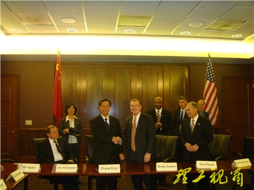 在加拿大圣力嘉学院,代表团一行与该校相关负责人就两校进行学生交换、教师交流等内容进行了深入探讨,为两校进一步交流合作打下了良好的基础。在美国世纪大学,两校负责人充分肯定了前期富有成效的合作,同时就合作过程中的有关问题进行了商谈,并就今后进一步进行合作交流达成了一致意见。在密苏里大学,代表团一行访问了工学院、农学院、生物工程系及相关实验室。密苏里大学举行了隆重的签字仪式,张新义校长代表学校与密苏里大学校长Brady J. Deaton签署了两校全面合作协议,与工学院、农学院和生物工程系分别签署了两校本科生合作培养协议。在加州大学戴维斯分校,代表团一行听取了该校相关负责人关于学校总体情况的介绍和对外交流培养的专题介绍,就两校已经进行的学生交流、教师进修等项目交换了意见,探讨了进一步合作的方式和内容。