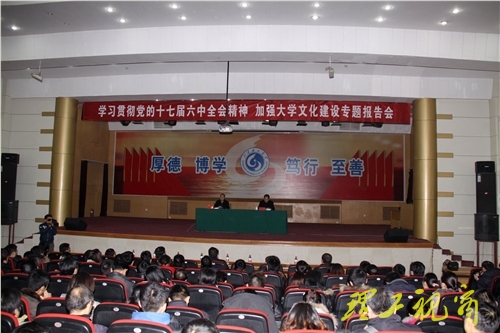 冯刚主任的报告结合党的十七届六中全会精神和中央领导同志的重要讲话精神,以渊博的知识、缜密的思维从加强高校文化建设是推动国家文化软实力提升的重要途径,提高国家文化软实力对加强高校文化建设提出的新要求,遵循文化发展规律、切实加强高校文化建设三个方面为我校师生阐述了高校文化建设的相关问题,使广大师生对贯彻落实党的十七届六中全会精神,加强大学文化建设有了更加深刻的认识。