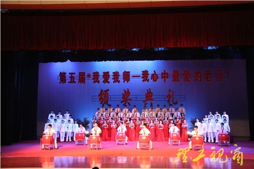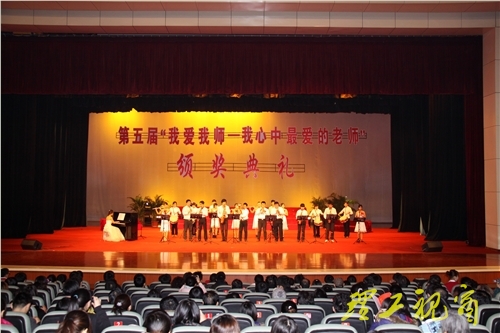 整个颁奖典礼过程中,穿插了学生自编自演的精彩的文艺演出,表达了同学们对获奖老师的祝福。歌曲《老师您好》寄托了广大学子对老师深深的问候,把温暖和感动融入到了在场每一位老师的心里;诗朗诵《那些心里话》那动人的字句,饱满的情感,使全场都沉浸在师恩难忘的气氛中。群舞《且吟春语》以极富想象力的舞蹈语言勾勒出春天的气息;拉丁舞《我的青春我做主》展现出当代大学生的朝气与蓬勃,颁奖典礼在配乐诗朗诵《中国少年说》中圆满落幕。