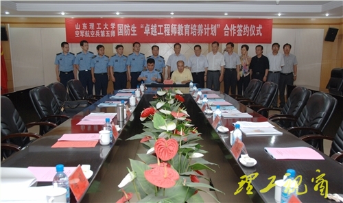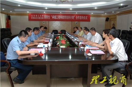张新义代表学校党委、行政向军队各位首长的光临表示热烈欢迎,并向来宾简要介绍了学校的情况。他说,长期以来,学校与济南军区空军依托国防生教育培养开展了大量卓有成效的合作。学校始终高度重视国防生教育培养工作,认真研究新型军事人才的培养规律和特点,形成了一套符合学校实际、有利于新型军事人才培养的国防生教育管理工作体系,国防生培养工作取得了显著成绩。此次,空军航空兵第五师与我校签署国防生“卓越工程师教育培养计划”,创新了空军依托培养国防生的新模式,体现了济南军区空军对我校国防生教育培养工作的充分肯定。我们将不断创新国防生人才培养模式,提高国防生培养质量,为国防现代化建设做出应有的贡献。