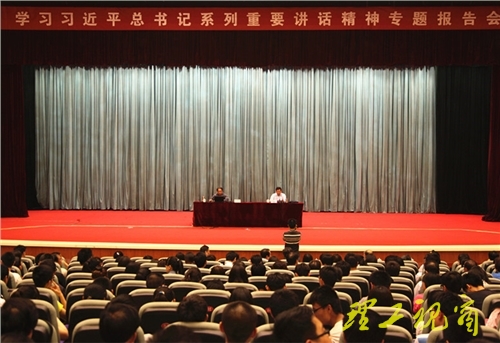 党的十八大以来,习近平总书记发表了一系列重要讲话,深刻阐述了党和国家发展的一系列重大理论和实践问题。为加深对习近平总书记系列重要讲话的理解和精神实质的准确把握,5月19日,学校特邀山东大学王韶兴教授为我校师生作专题辅导报告。 报告会在大学生艺术中心礼堂举行,校领导都光珍、张新义、谭秀森、杜瑞成、张宇声、衣玉琛、吕传毅、邹广德及各部门、学院负责人和部分师生代表听取了报告。报告会由校党委副书记谭秀森主持。 王韶兴教授从全球化背景下世界经济、政治、文化、信息、生态的特点、中国国情的深刻变化以及政党文明视野中的执政党建设,介绍了习近平总书记系列重要讲话的背景,阐述了系列重要讲话的内容和特色,分析了贯穿其中的执政理念和执政风格,阐明了总书记系列讲话所显示的鲜明的价值指向,并对如何贯彻落实系列重要讲话精神谈了自己的看法。 谭秀森在报告会总结时指出,王韶兴教授的辅导报告既有很高的理论深度,又有很强的现实针对性,对于深入学习贯彻习近平总书记系列重要讲话具有重要的指导作用。他要求,学习贯彻习近平总书记系列重要讲话精神是一项长期的重要政治任务。学校各级党组织、各单位,要在今天辅导报告会的基础上,继续采取各种有效形式,组织干部、师生深入学习习近平总书记系列重要讲话,特别是总书记对教育和教育工作的一系列重要论述,深刻领会讲话的科学内涵和精神实质,努力提高思想理论水平,自觉地把社会主义核心价值体系融入学校教育发展全过程,进一步统一思想、凝聚力量、推动学校各方面工作,促进学校改革发展各项目标任务的顺利实现。 |