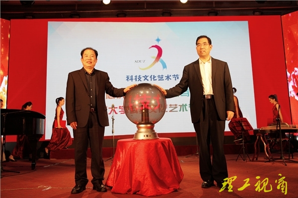在激昂的音乐声中,校党委书记都光珍、校长吕传毅手扶LED球,共同开启了科技文化艺术节。
