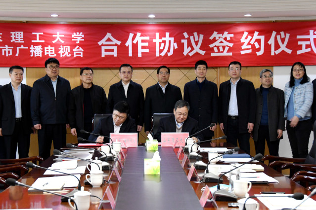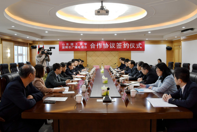 2月20日上午,我校与淄博市广播电视台全面合作签约仪式在鸿远楼九楼会议室举行。校党委书记吕传毅,校党委常委、副校长王立斌,淄博市广播电视台党委书记、台长、市广播影视传媒集团董事长王旭,市广播电视台党委委员、技术中心主任刘晓亮出席仪式,我校党委(校长)办公室、党委宣传部、合作发展处、计算机科学与技术学院、文学与新闻传播学院相关负责人,市广播电视台有关部门负责人参加仪式。仪式由王立斌主持。