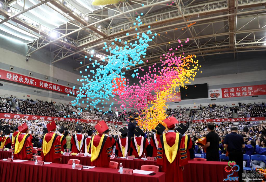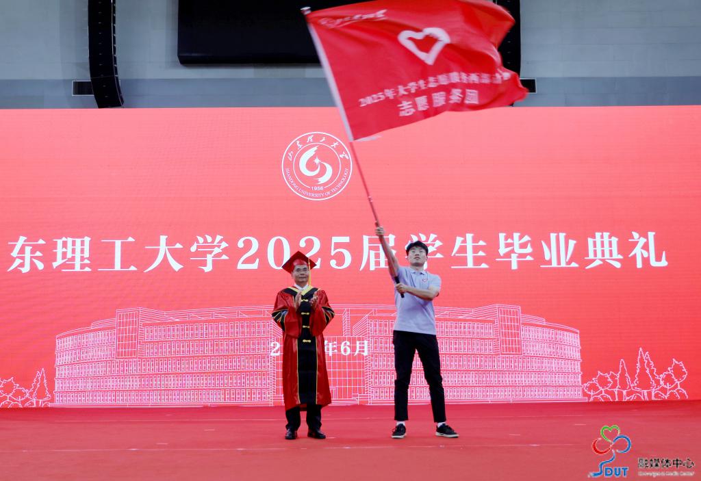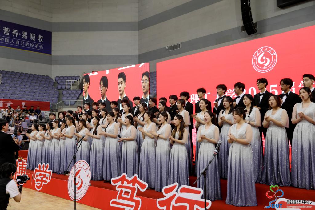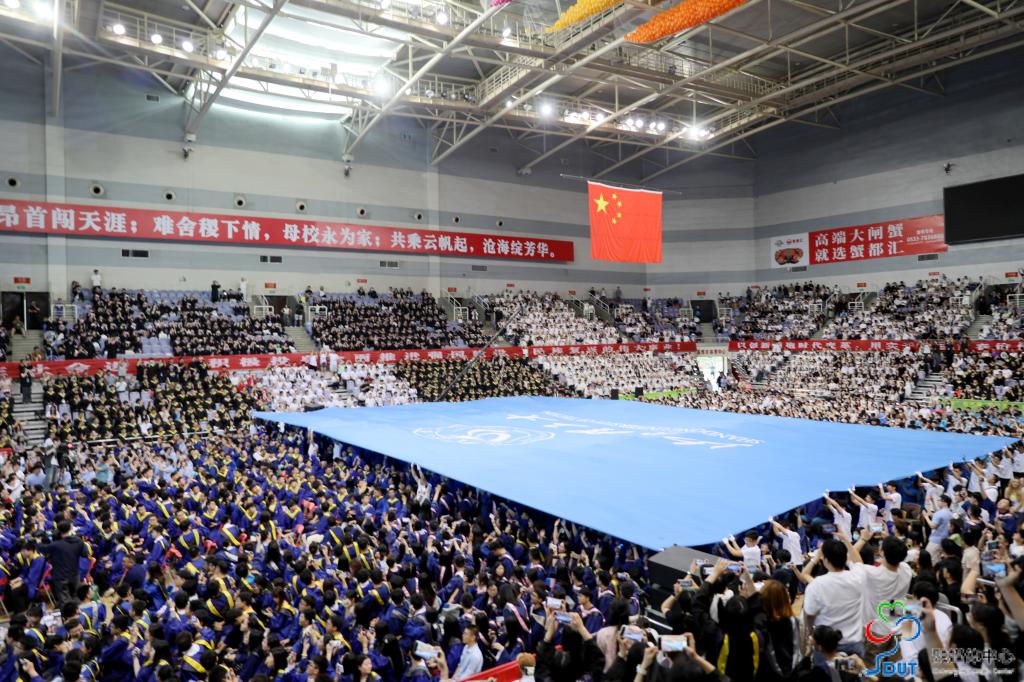 在全场齐唱《你伴随我》校歌声中,伴随着巨幅校旗的现场传递,毕业典礼圆满落幕。