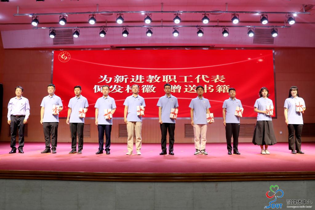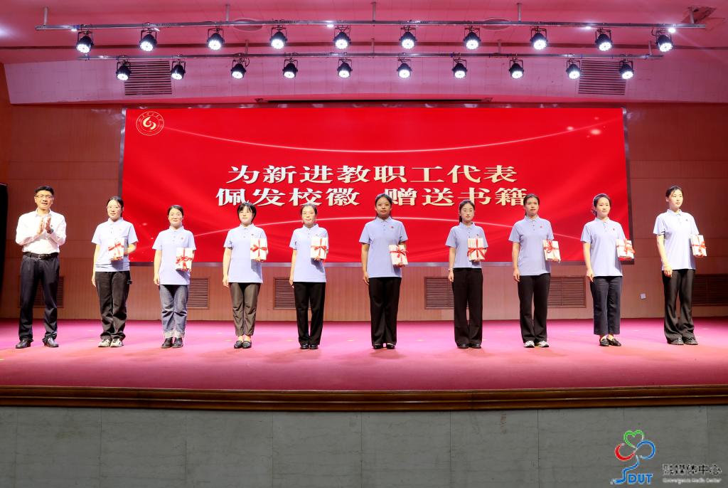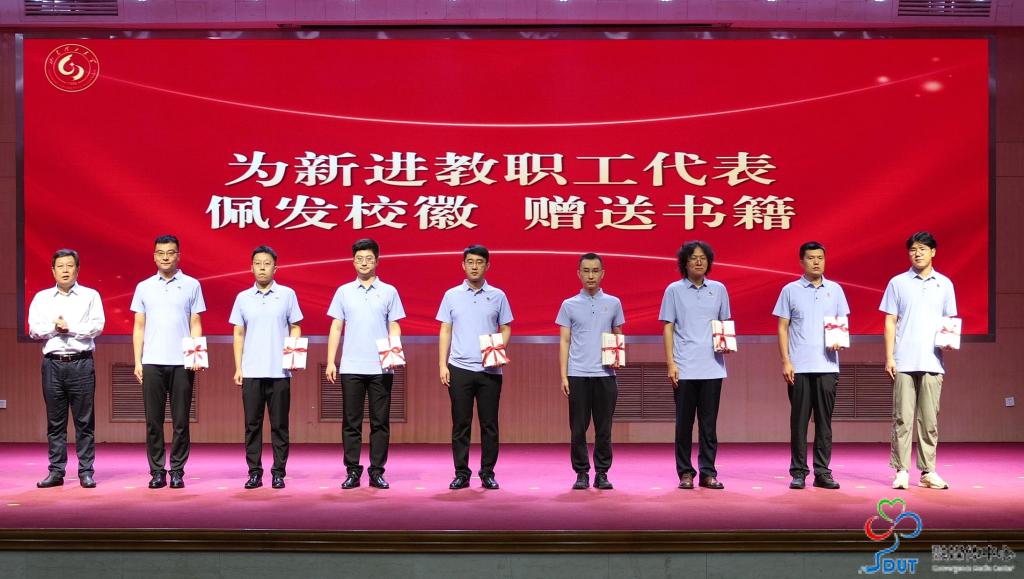 典礼上,于红波、苏守波、杜方岭分别为新进教职工代表佩发校徽并赠送书籍。