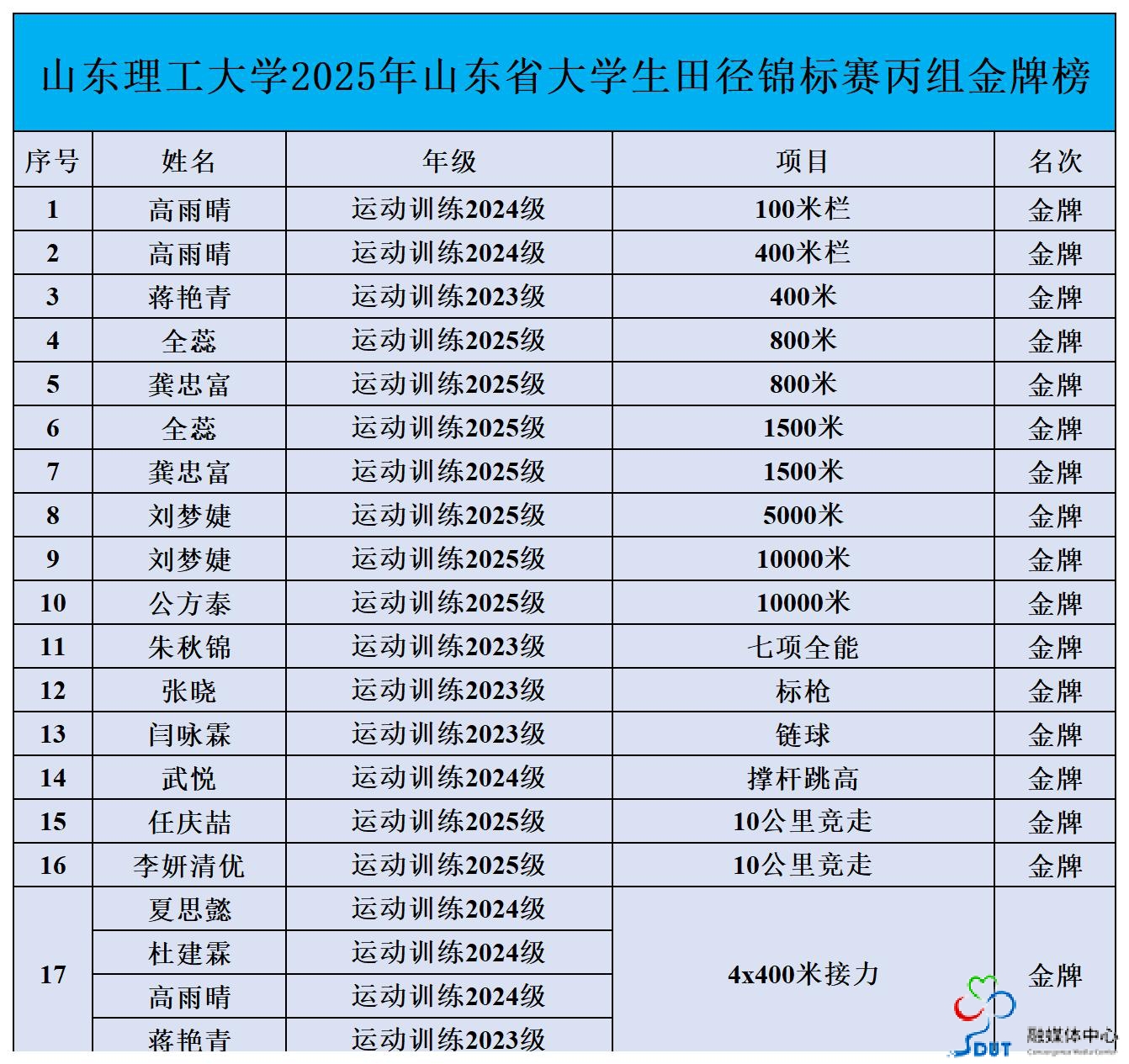 10月8日至14日,2025年山东省大学生田径锦标赛在潍坊奥林匹克体育公园举办,我校代表队参加甲组(本科院校普通学生)、丙组(体育专业学生)比赛,经过激烈角逐,夺得丙组团体总分、金牌数、女子团体总分等3个全省高校第一名,男子团体总分第二名的优异成绩;丙组摘得17枚金牌、12枚银牌、5枚铜牌,甲组收获1枚银牌、2枚铜牌,金牌数创历史新高;学校获“体育道德风尚奖”。这是自2019年我校获该赛事丙组团体总分第一名后重返巅峰。