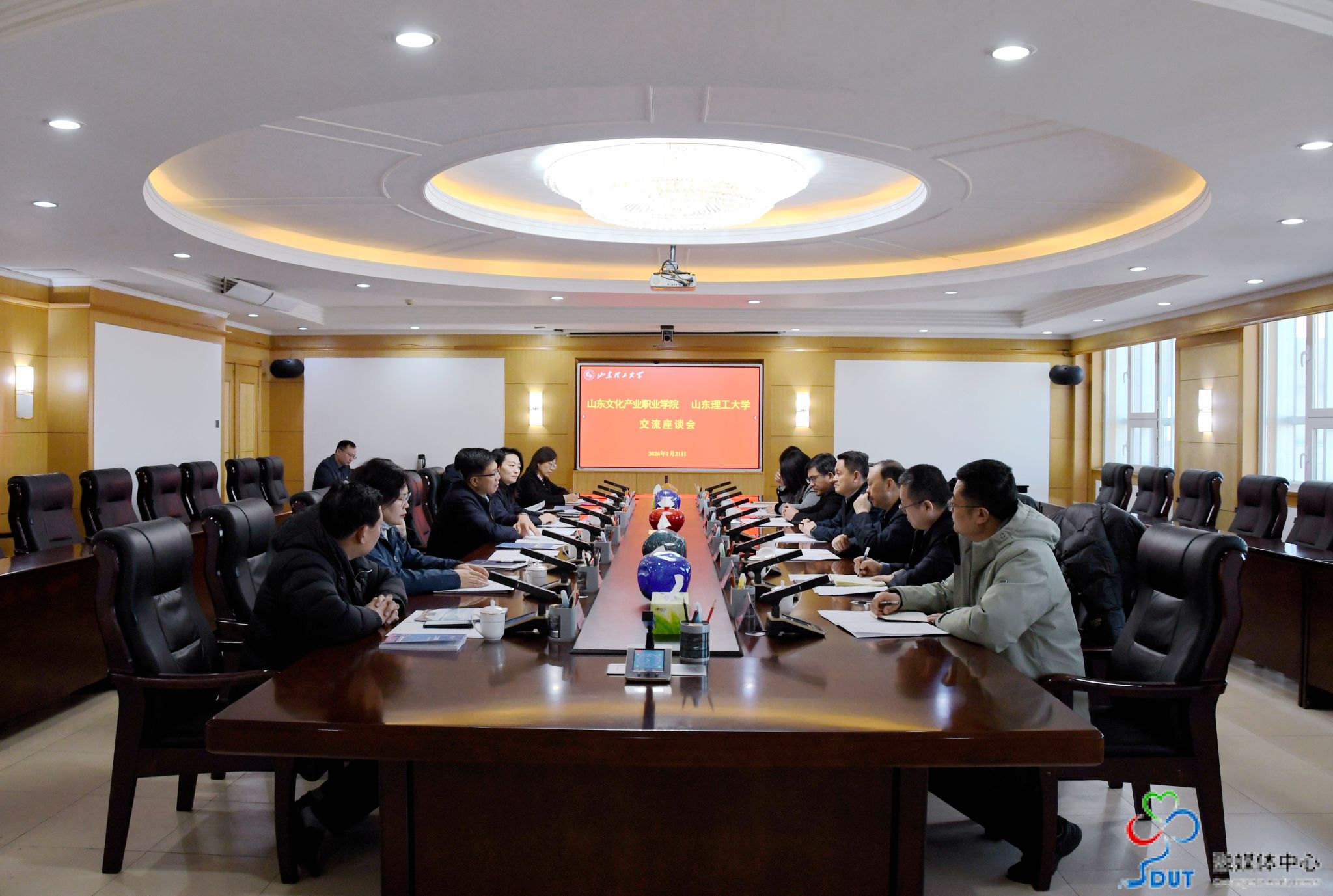 本网讯 1月21日上午,山东文化产业职业学院董事长李京平、校长曹胜强一行七人来校,围绕学科建设、人才培养、科研创新等开展考察交流。校党委书记于红波,党委常委、副校长庞秋香,党委常委、宣传部部长刘兴清在鸿远楼九楼会议室与客人座谈交流。