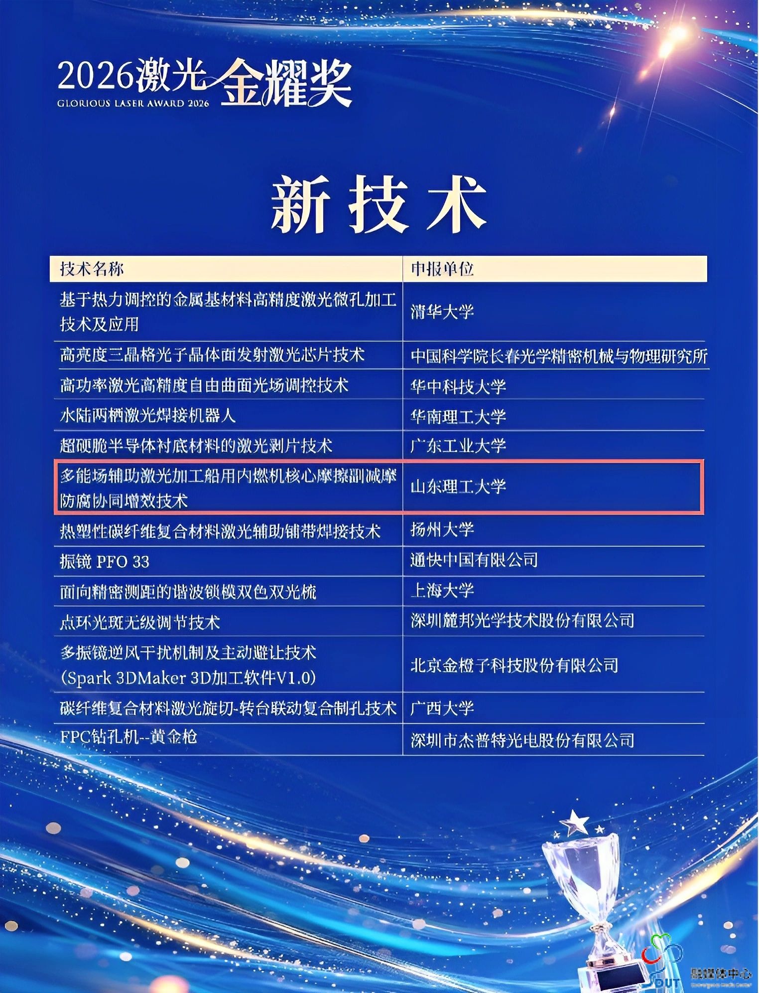 近日,“2026激光金耀奖”颁奖典礼在上海隆重举行,来自全国各地的激光领域专家学者、产业领军企业代表及行业机构齐聚一堂,共同见证中国激光产业年度创新成果的荣耀时刻。经行业资深专家多维度综合评审,机械工程学院激光高端制造研究中心申报的“多能场辅助激光加工船用内燃机核心摩擦副减摩防腐协同增效技术”荣获“2026激光金耀奖”新技术奖,继2025年获得“激光金耀奖”新应用奖后中心再次获此殊荣。