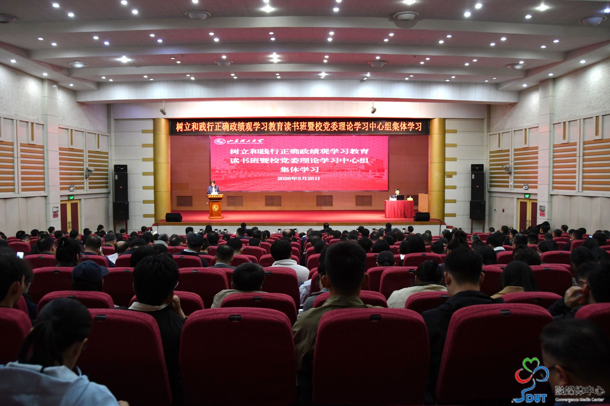 读书班举行学习教育辅导报告会暨校党委理论学习中心组(扩大)集体学习,邀请中共山东省委党校(山东行政学院)马克思主义学院副院长骆乾作辅导报告。骆乾围绕“树立和践行正确政绩观”这一主题,从深刻领悟“政绩为谁而树”的政治立场、准确把握“树什么样的政绩”的核心要义、系统掌握“靠什么树政绩”的实践要求等三个方面,进行了深入解读和系统阐述,为党员干部上了一堂生动鲜活的党课。